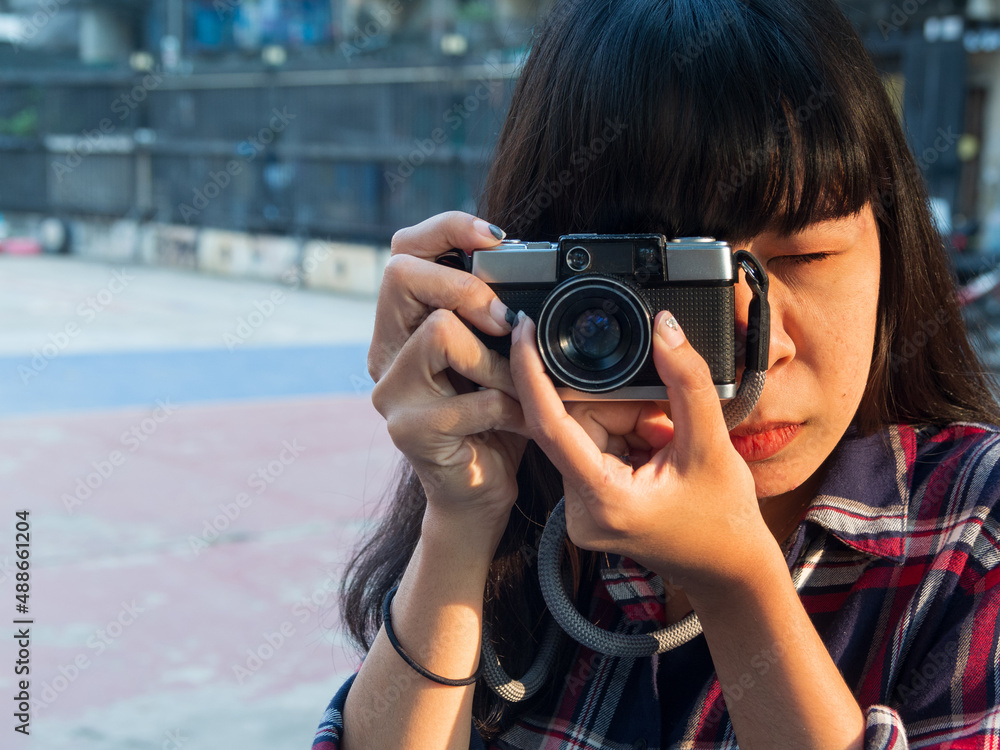 Portrait Woman Asian Girl 20 25 Years Long Black Hair Red Shirt Dark Red Taking Picture